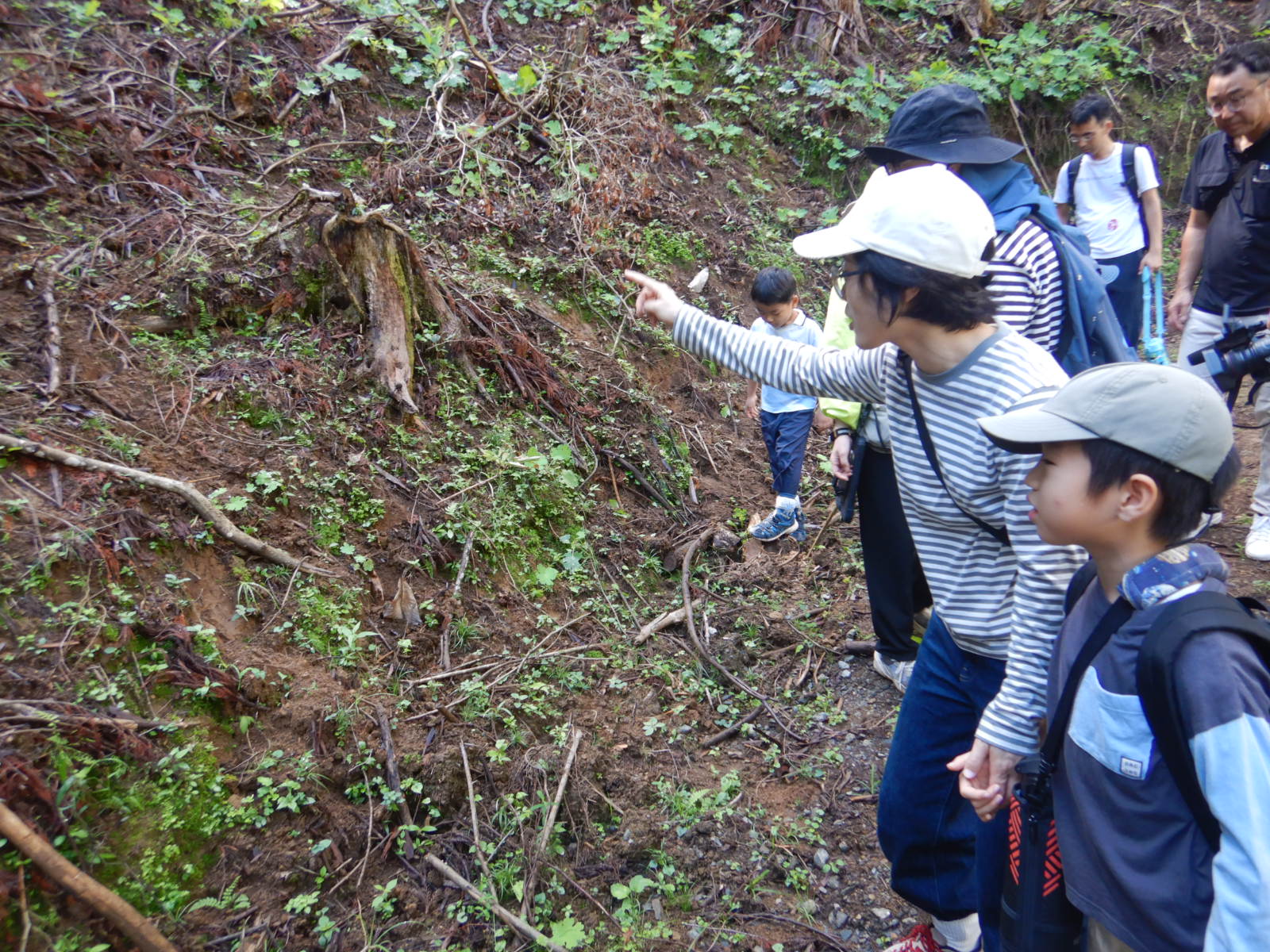 「ここにも足跡があるよ!ここから降りてきたのかな?」 一度 ”痕跡探しの目” になると森の中は生きものたちの痕跡でいっぱいです。