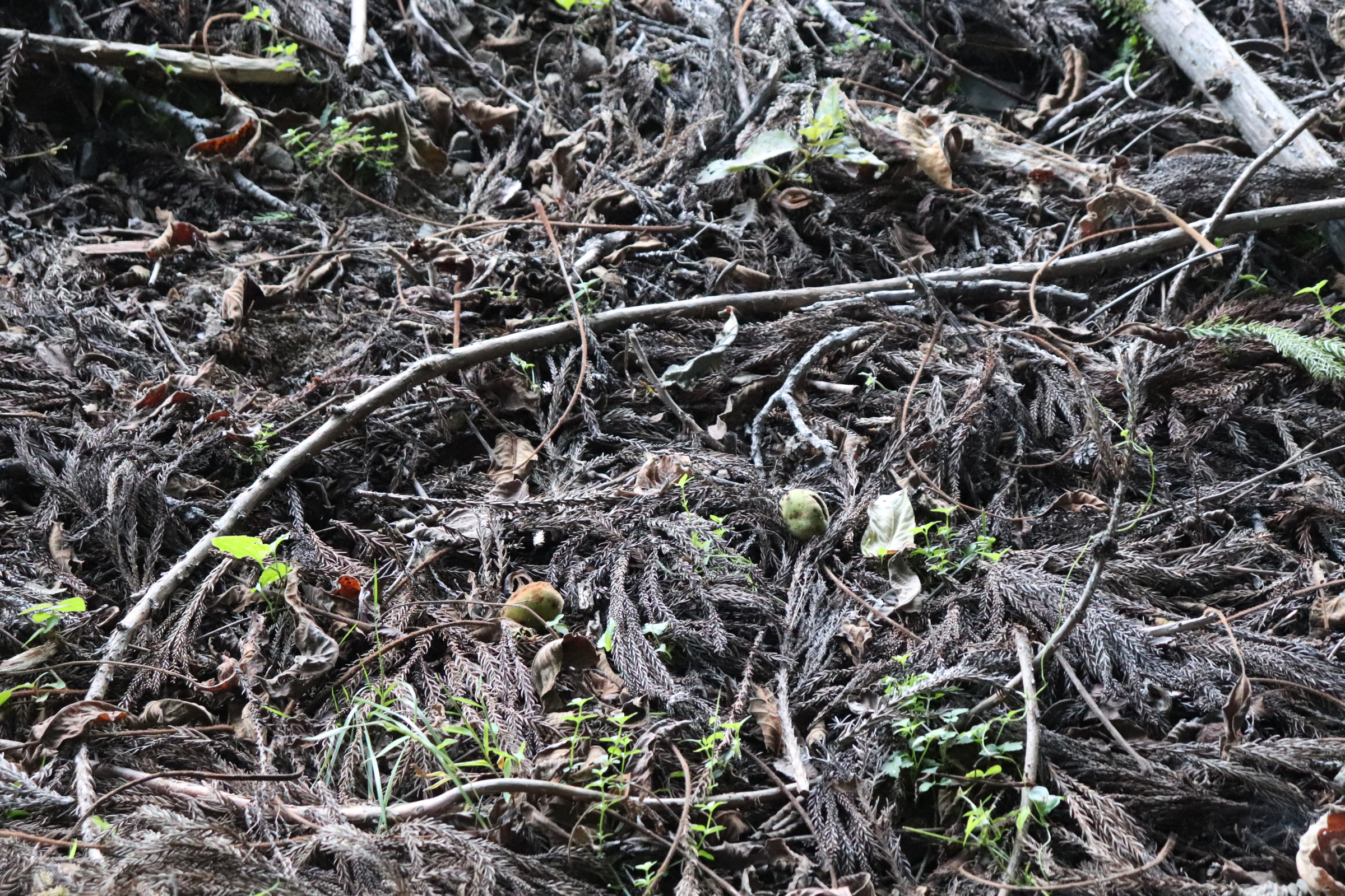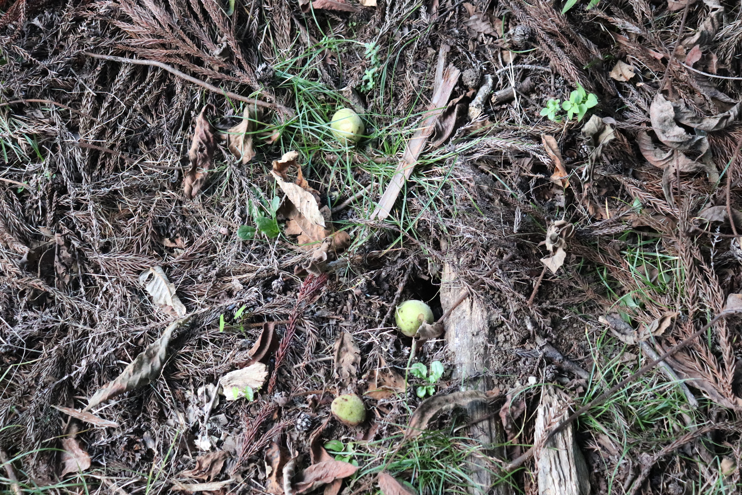 歩いている最中、斜面沿いにたくさんのクルミが落ちているのを発見!