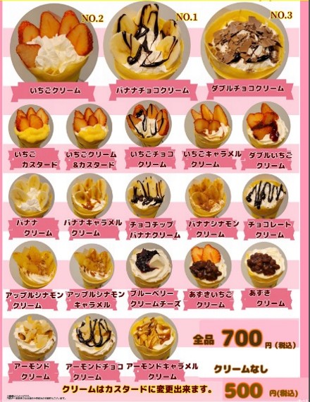 クレープがメインのスイーツ専門店です。クレープは生地にこだわりふわふわしっとりでクリームとの相性抜群です。チョコバナナは可愛くデコレーションしています。