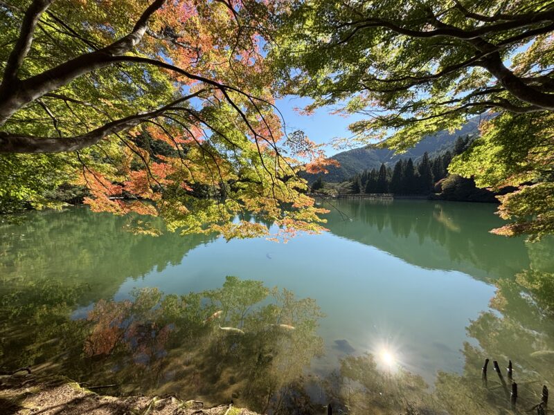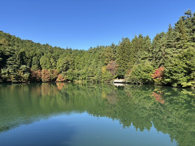 南伊奈ヶ湖の湖面にも青空が映り、それと一緒に少し色づいた木々も映りこんでいました。