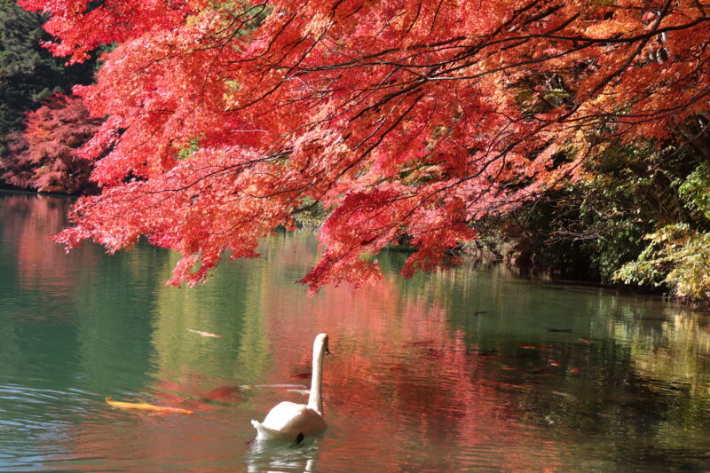 湖側にあるイロハモミジたちも色づき、ハクチョウとのコラボや水面に映る紅葉が見られます!