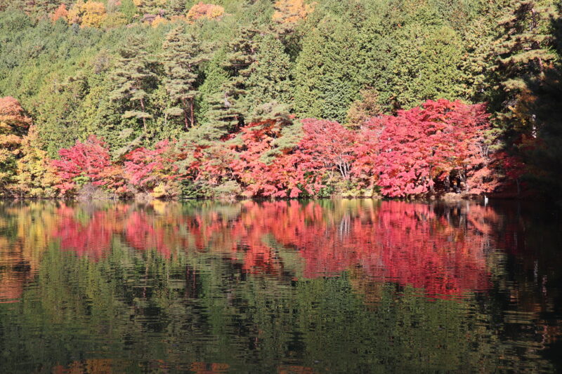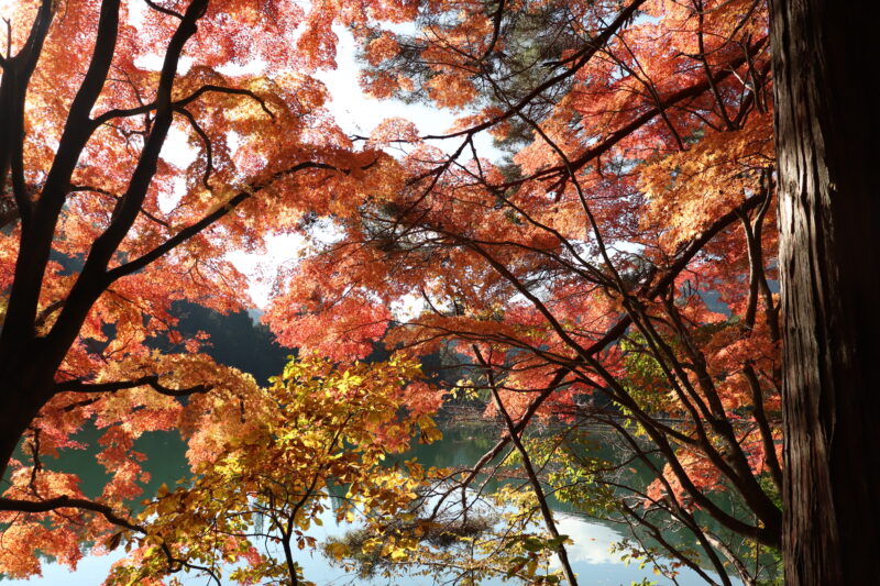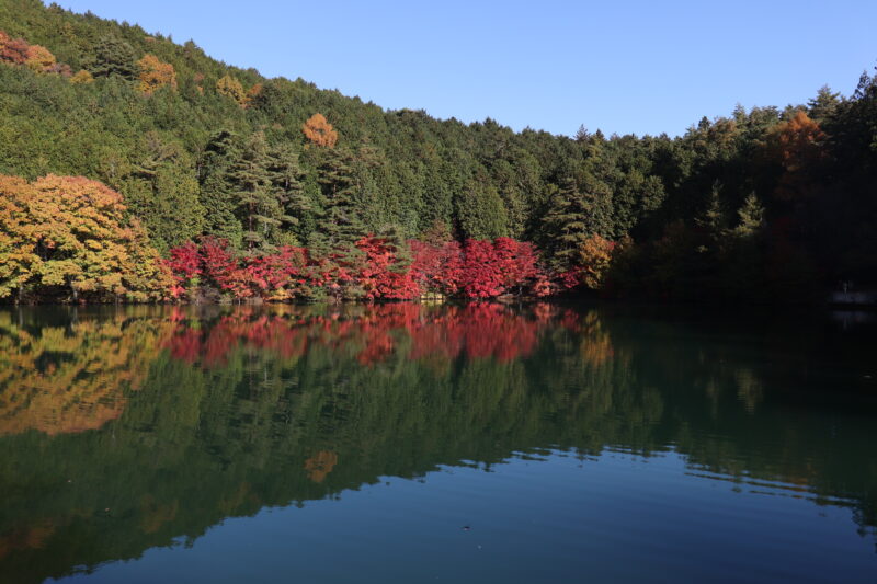 ウッドデッキや南伊奈ヶ湖南側の堤防からみる湖には、紅葉する木々たちが反射して揺らめいています。