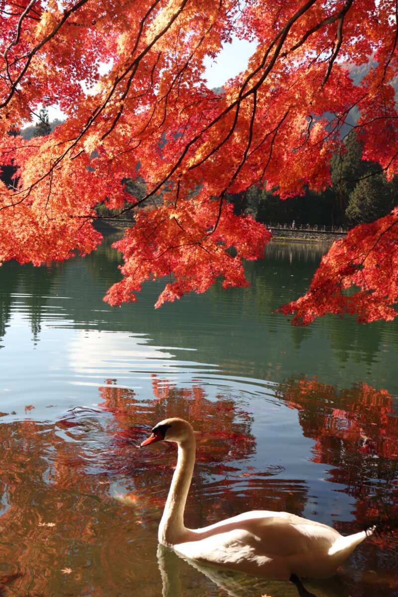 赤いイロハモミジと白いハクチョウでお互いに映える組み合わせです。