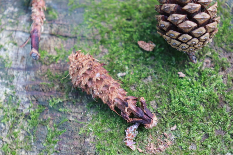 リスの食べあと。園内にはリスがまつぼっくりを食べた跡が至る所に散らばっています。