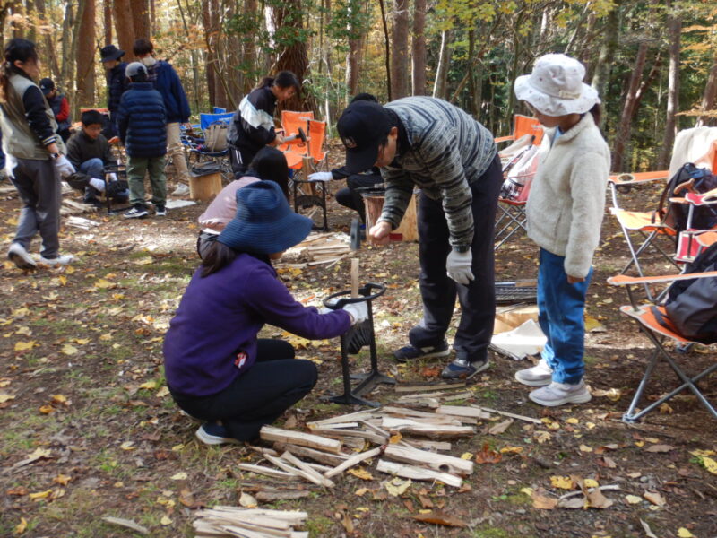 焚き火カフェは参加者の方に「薪割り」、「火起こし」、「お湯沸かし」まですべて自分たちでやってもらう自然教室!