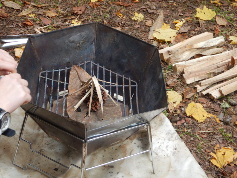 まず焚き火台を組み立てて、細い薪が隙間から落ちないようにホオノキの葉を敷きます。