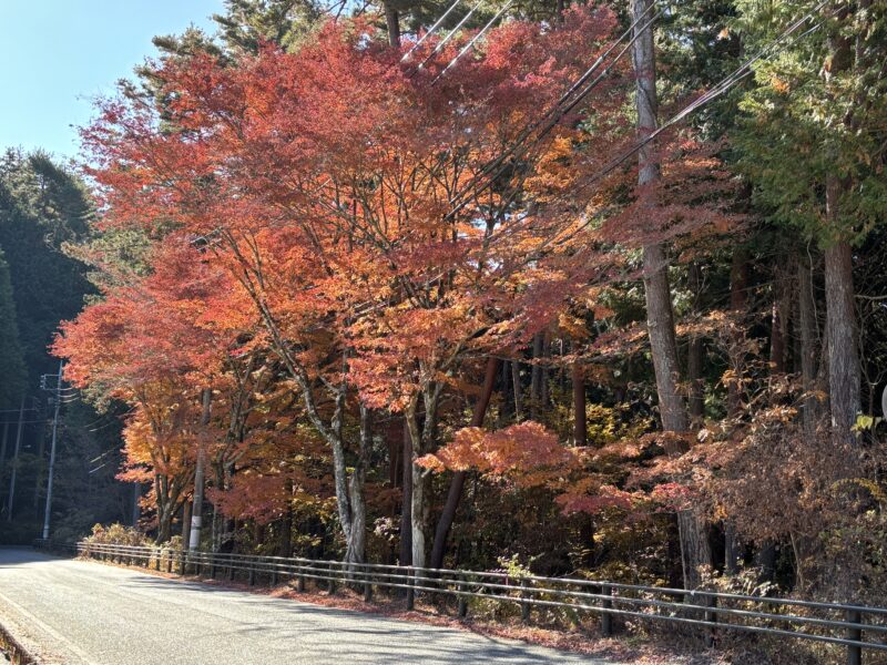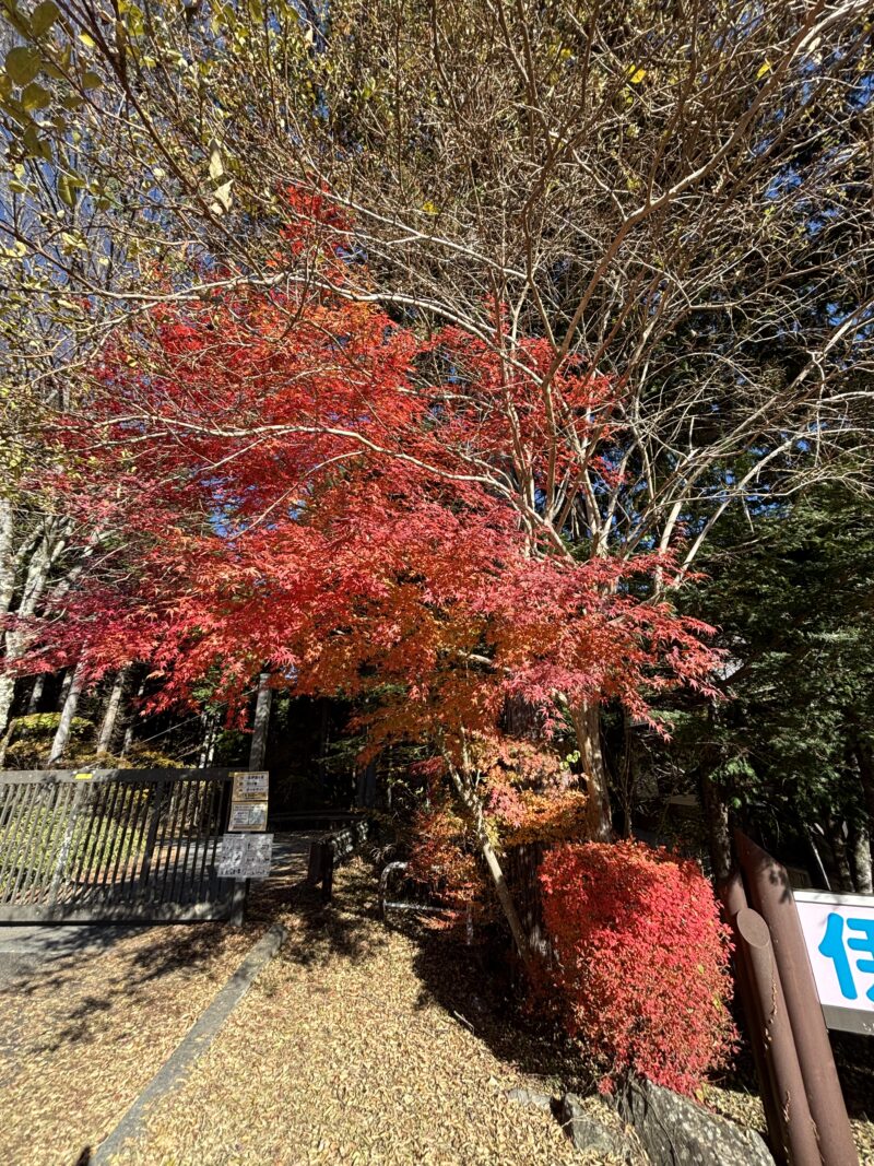 第一駐車場から出たところのモミジは、枝先は落葉しましたが、枝半ばは今日も鮮やかです。
