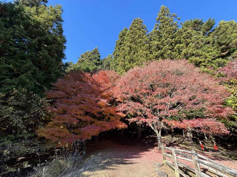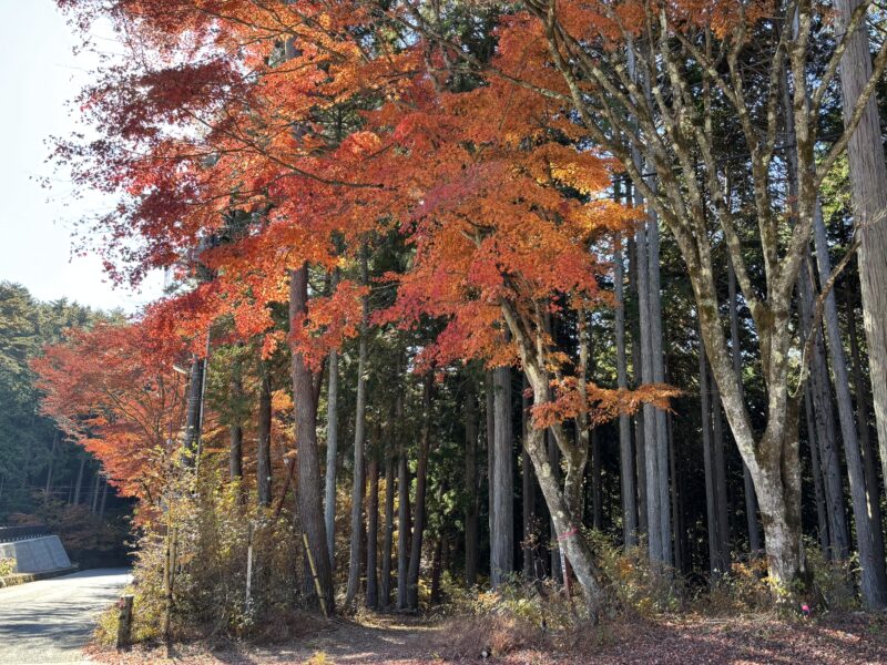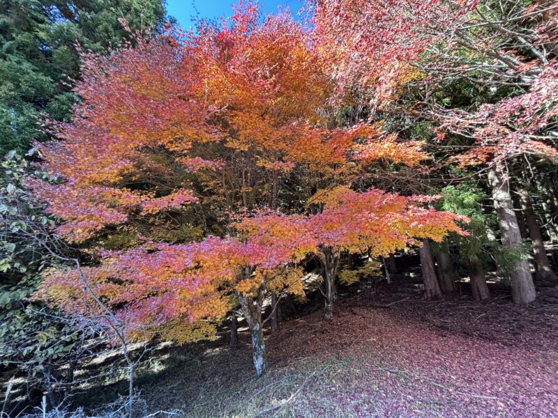 右が落葉の絨毯を作っているのに、左は枝先を鮮やかに染めてる最中です。