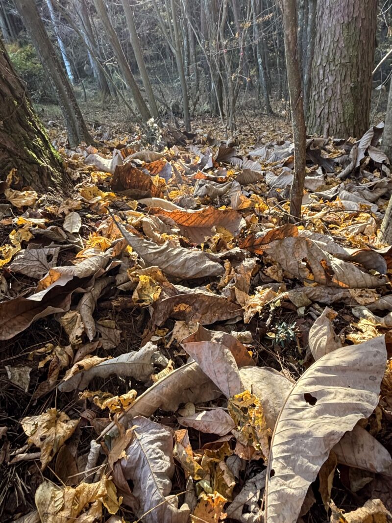 「いやしのこみち」横はカエデのなかまにホオノキに、たくさんの落葉でフカフカです。