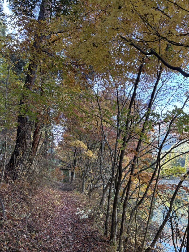 湖の東側の小道にはいります。モミジの落葉を踏みつつ進みます。
