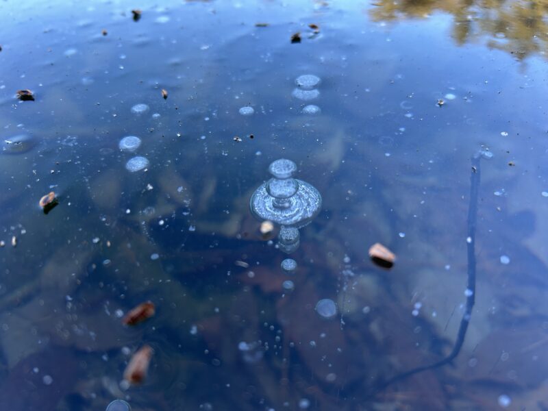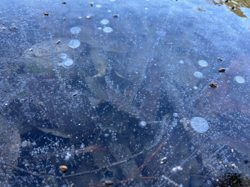 氷に閉じ込められた空気の泡の列です。とても神秘的です。
