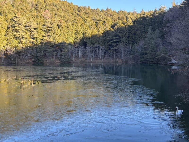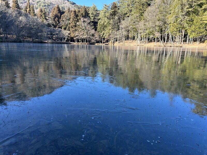 いつもなら鏡のように空と周囲の木々を映している南伊奈ヶ湖ですが、今は大きな氷が張っています。