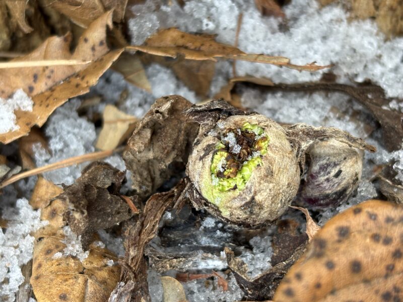 落ち葉の下で固く小さく丸く、春の訪れを待つフキノトウ。