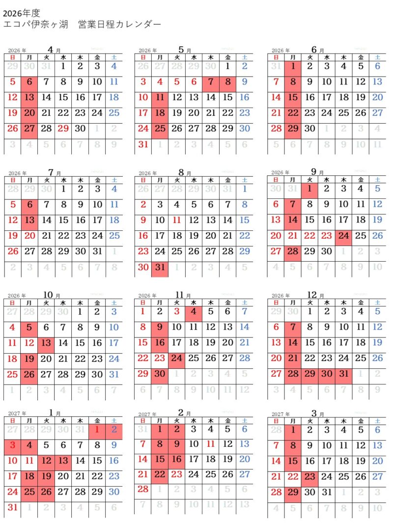 2026年3月1日 / 最終更新日時 : 2026年3月7日 エコパ伊奈ヶ湖 お知らせ 年間休館日情報について いつもエコパ伊奈ヶ湖をご利用いただきまして 誠にありがとうございます。 令和8(2026)年度の休館日カレンダーは 以下の通りです。ご利用日を検討される際の 参考にご利用下さい。 FacebookXHatenaPocket