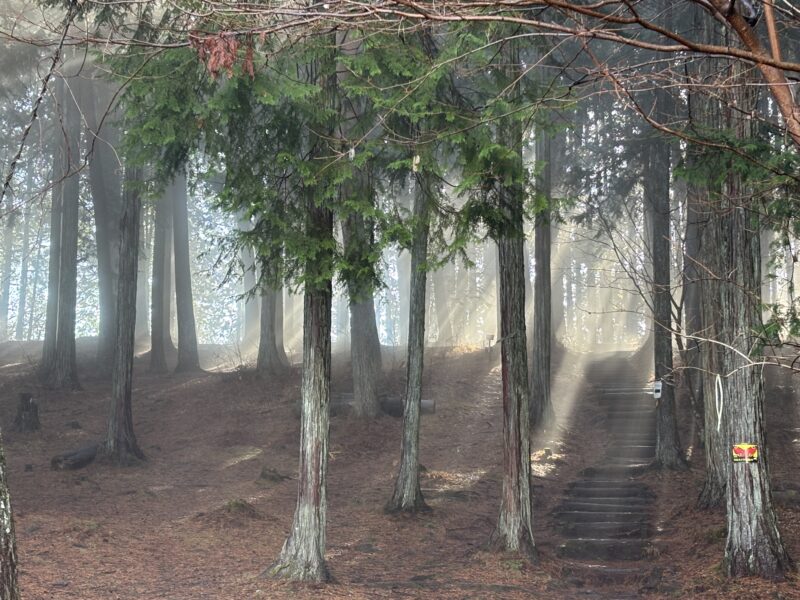 テントサイトのヒノキの枝の隙間から光の筋が延びています。